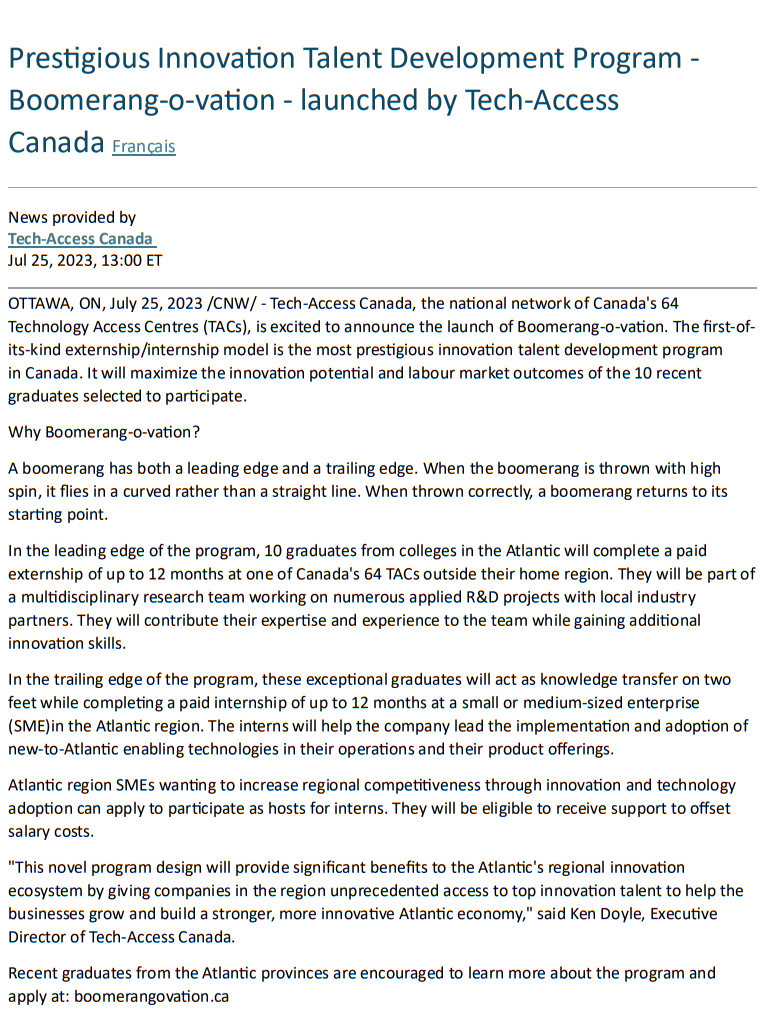 OTTAWA, ON, July 25, 2023 /CNW/ – Tech-Access Canada, the national network of Canada’s 64 Technology Access Centres (TACs), is excited to announce the launch of Boomerang-o-vation. The first-of-its-kind externship/internship model is the most prestigious innovation talent development program in Canada. It will maximize the innovation potential and labour market outcomes of the 10 recent graduates selected to participate.
