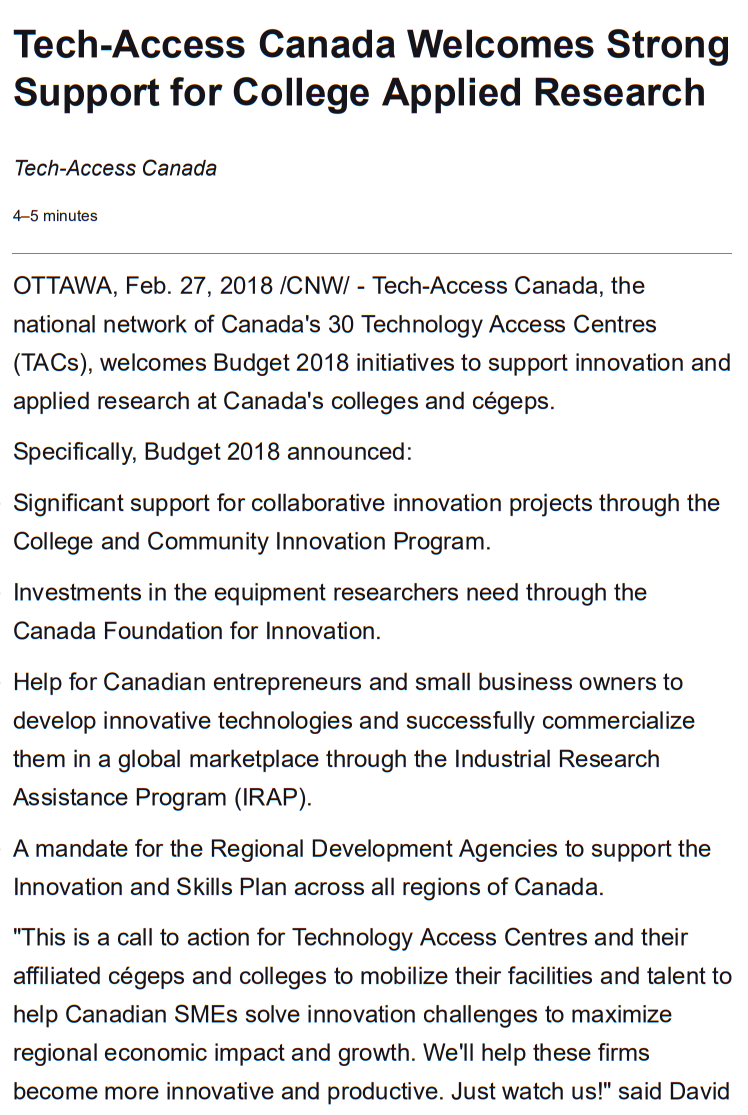 OTTAWA, Feb. 27, 2018 /CNW/ – Tech-Access Canada, the national network of Canada’s 30 Technology Access Centres (TACs), welcomes Budget 2018 initiatives to support innovation and applied research at Canada’s colleges and cégeps.