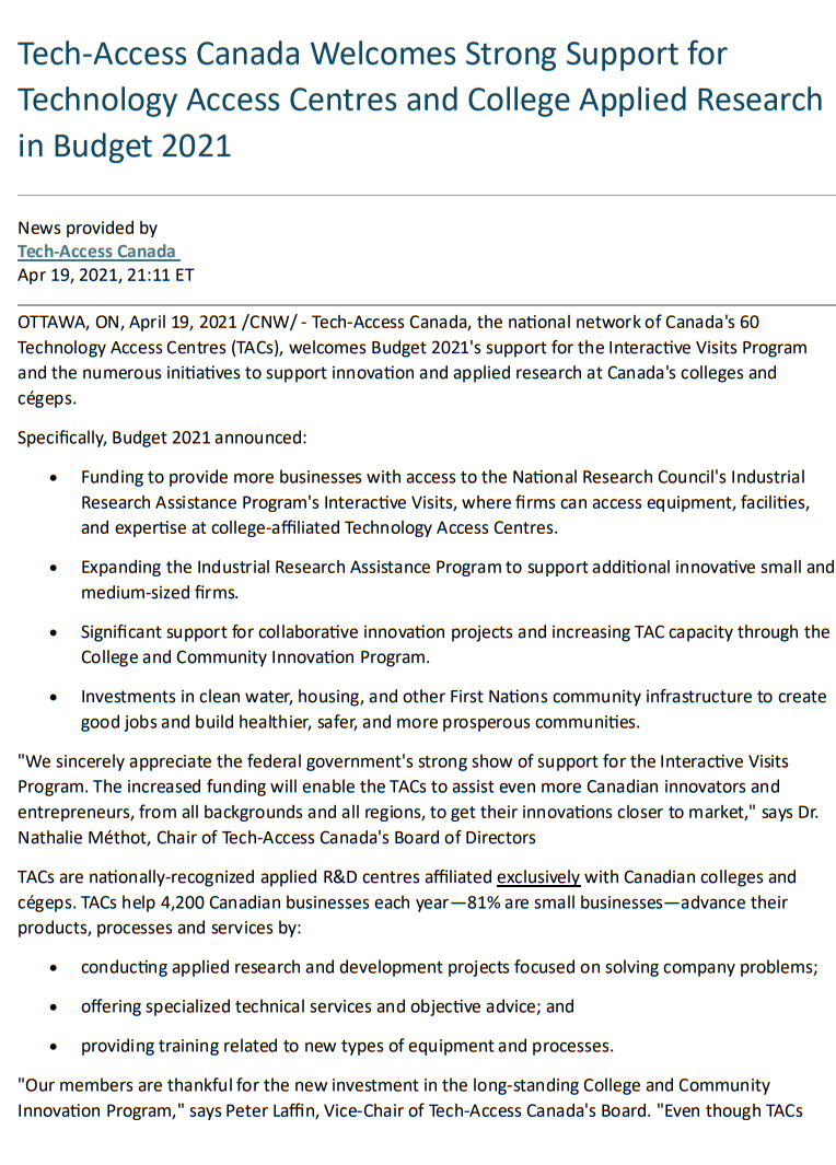 Tech-Access Canada Welcomes Strong Support for Technology Access Centres and College Applied Research in Budget 2021