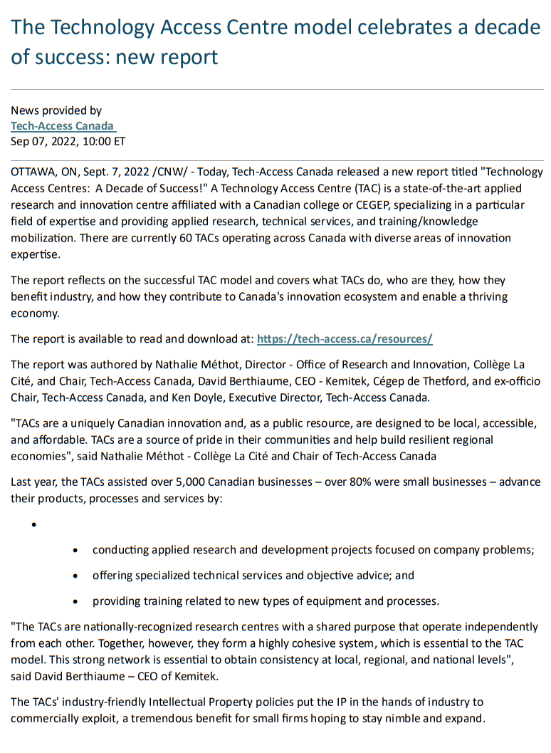 OTTAWA, ON, Sept. 7, 2022 /CNW/ – Today, Tech-Access Canada released a new report titled “Technology Access Centres: A Decade of Success!” A Technology Access Centre (TAC) is a state-of-the-art applied research and innovation centre affiliated with a Canadian college or CEGEP, specializing in a particular field of expertise and providing applied research, technical services, and training/knowledge mobilization. There are currently 60 TACs operating across Canada with diverse areas of innovation expertise.